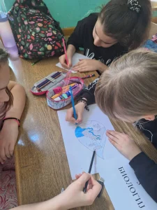 Уз дружење и забаву деца су цртала по полигону и тимским радом стварала заједничке цртеже показујући при раду разумевање једних за друге, дељење заједничких идеја , договарања.